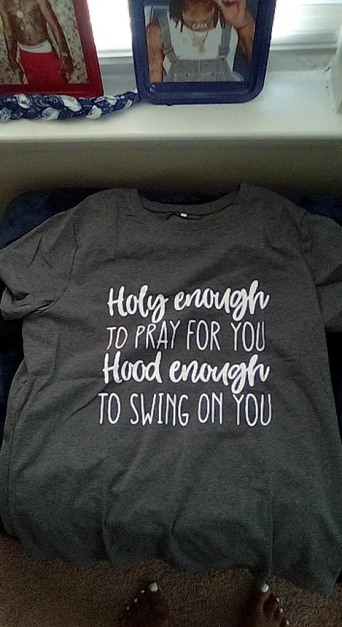 • Features:Holy Enough To Pray For You Hood Enough To Swing On You Funny Letter Printed T-Shirt,Casual Loose Fit Tops,Short Sleeve,O-neck,Regular Fit.